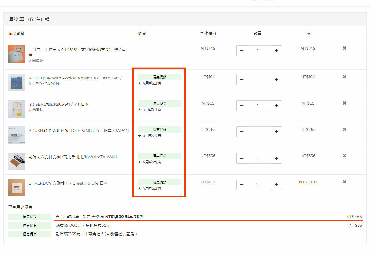 ※ 可於購物車結帳頁面(如下圖),確認商品有沒有優惠或是滿額,有喜歡都可以先加入購物車再逐步篩選喔。